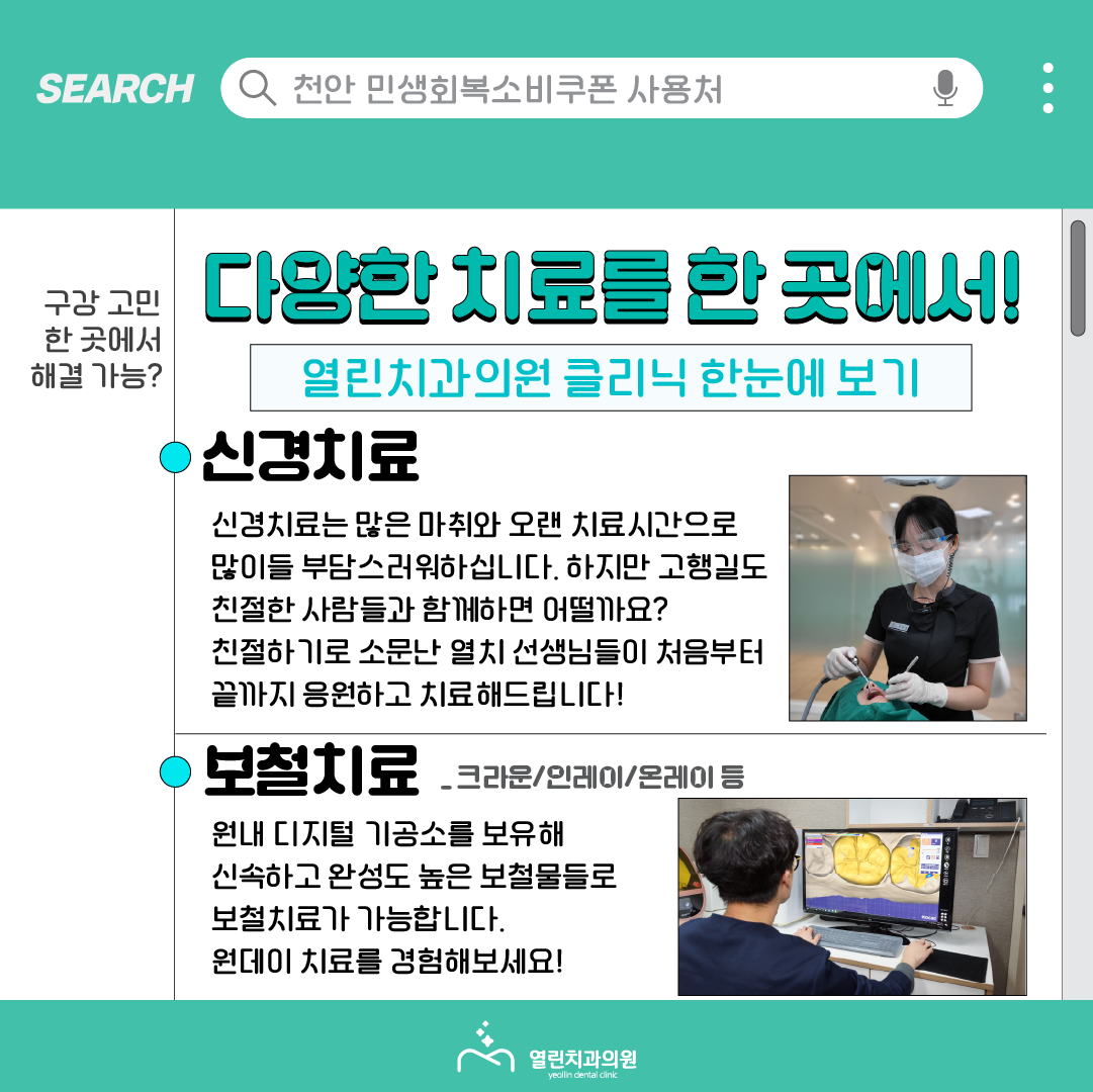 저희 열린치과의원은 이번에 지급된 민생회복소비쿠폰이 사용 가능한 사용처 입니다!