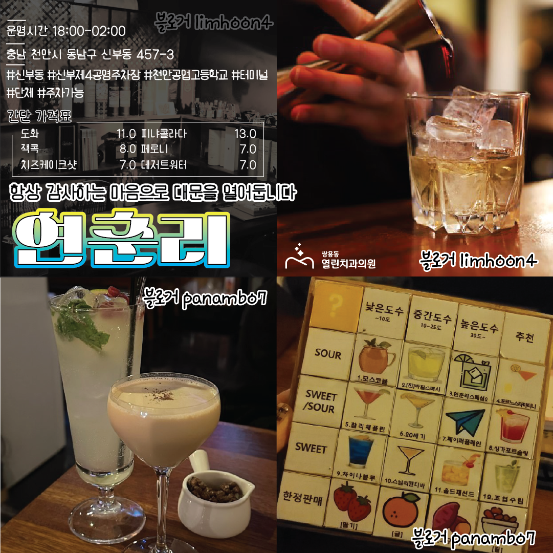특별한 시그니쳐 벽면과 재미있는 메뉴판들과 맛있는 칵테일이 있는 '연춘리' 입니다.