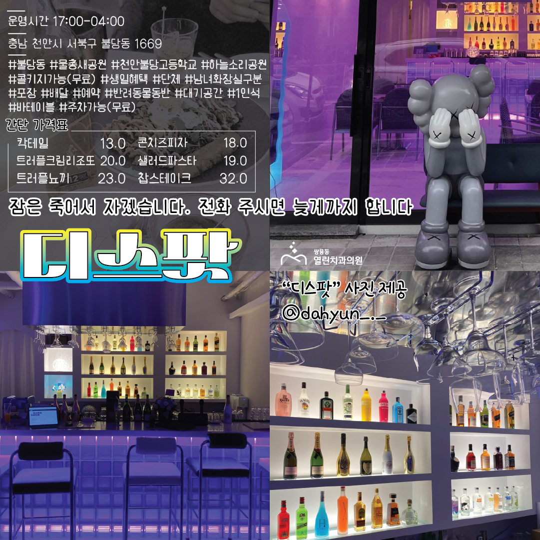 분위기 좋은 칵테일바에서 혼자오셔도 되고 반려동물과 오셔도 즐기실 수 있는 '디스팟' 입니다.