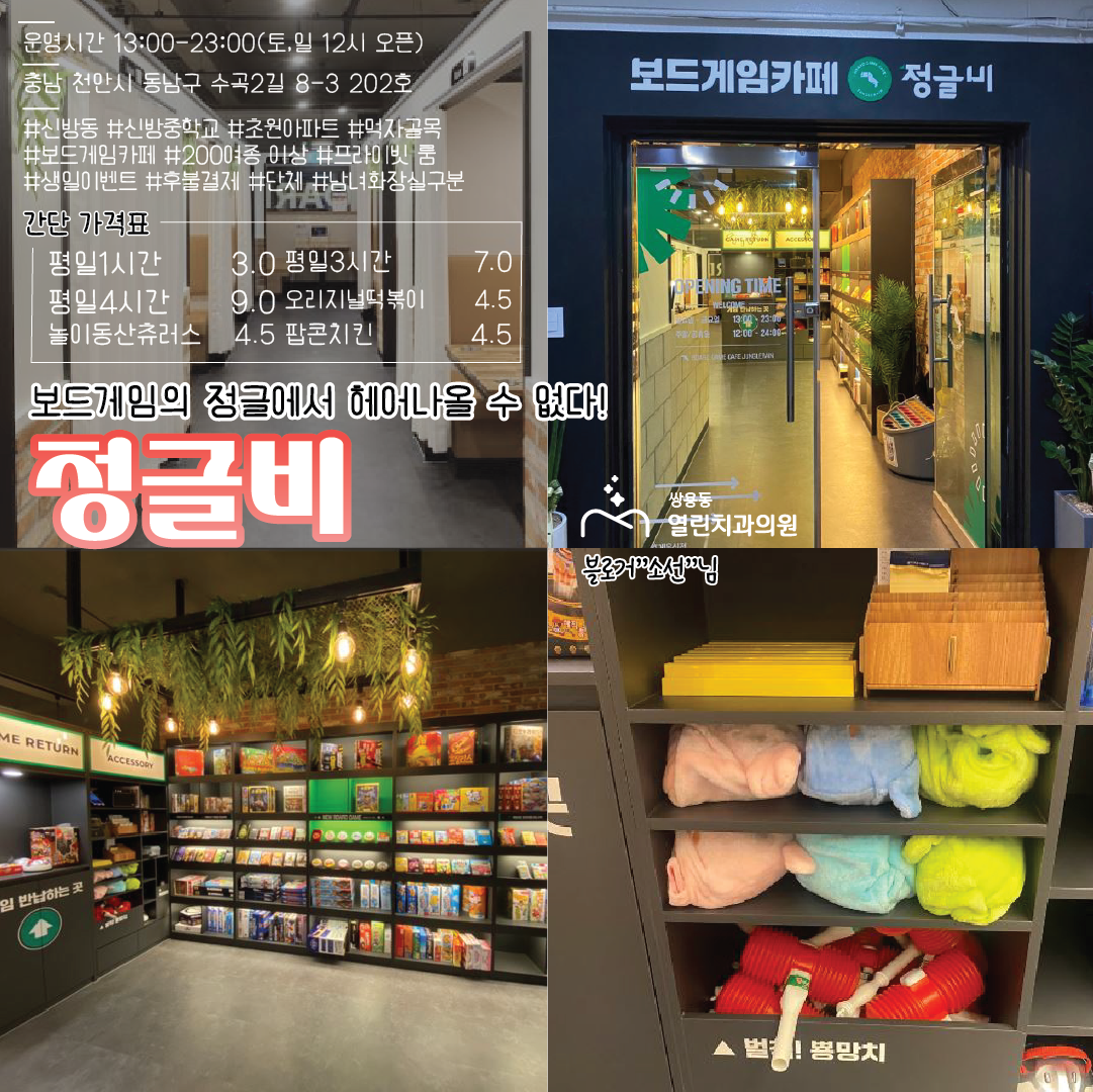 200여개가 넘는 보드게임과 맛있는 간식들을 먹으며 동심을 찾을 수 있는 정글비 보드게임카페 입니다.